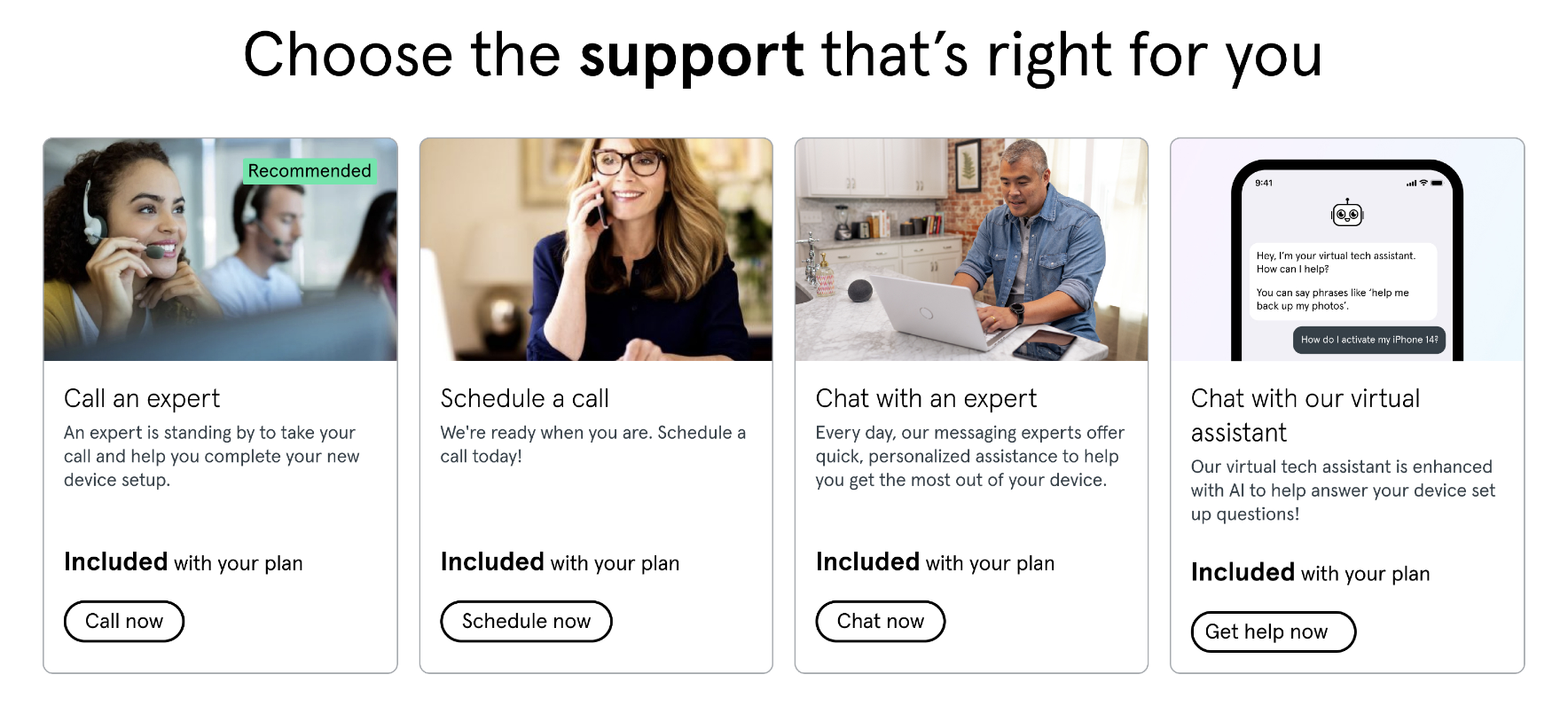 Learnings not only shaped the landing page in question, but also established UX Design principles for other client tech support entry points including for Google and Verizon chat experiences.